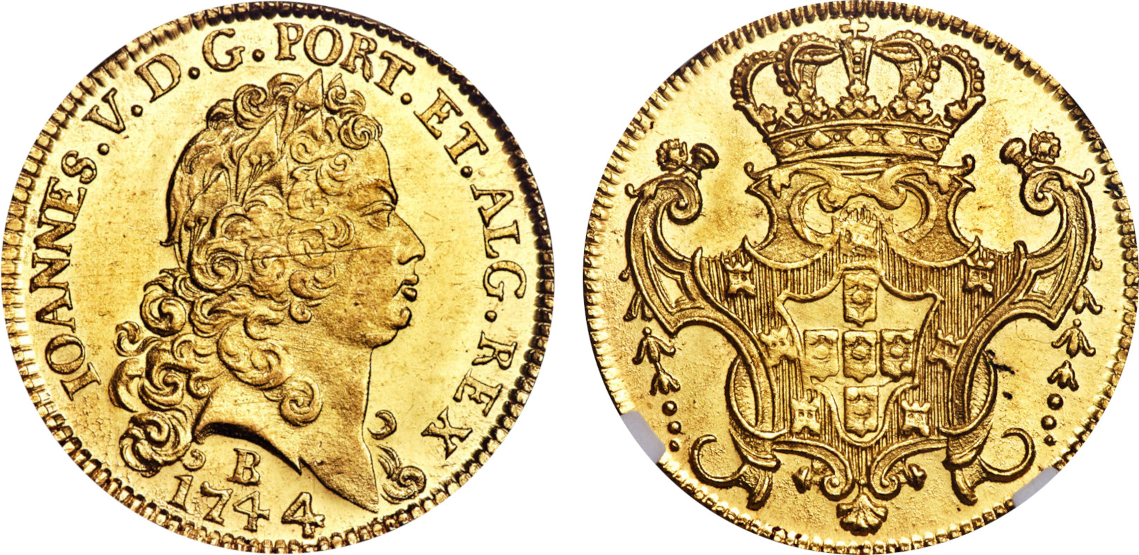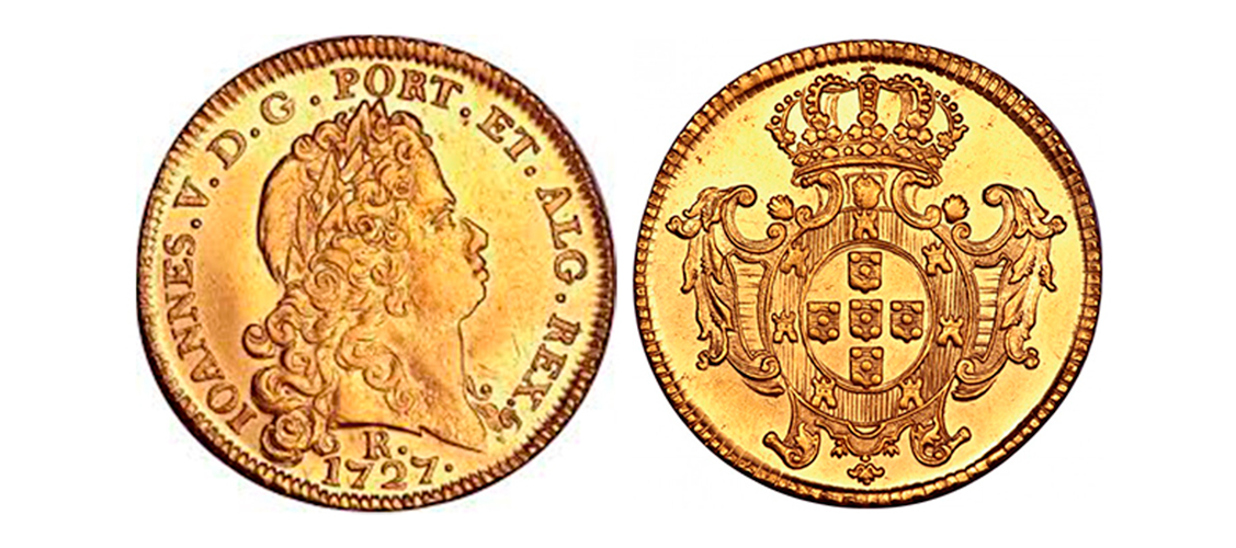 Peça de ouro cunhada durante o reinado de Dom João V, período de auge da mineração. Representava riqueza e poder na economia colonial. Em 2012, foi vendida por US$ 43.750, tornando-se um dos maiores ícones da numismática brasileira.