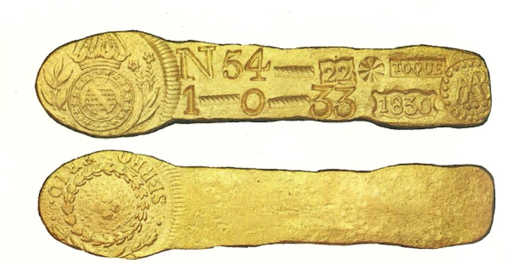 Além das moedas, barras de ouro circularam como meio legal de pagamento. Cada uma era marcada para comprovar autenticidade e recolher o “quinto”, imposto de 20% sobre a produção. Um exemplar de 217,9 gramas alcançou R$ 1,5 milhão em leilão de 2018.