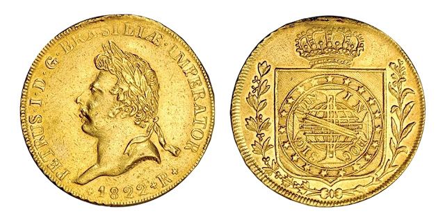 A peça mais valiosa da numismática brasileira. Cunhada logo após a Independência, comemora a coroação de Pedro I. Apenas 16 exemplares são conhecidos, sete em museus e nove em coleções privadas. Uma dessas moedas foi vendida em 2014 por US$ 99.375. É considerada a maior preciosidade da numismática brasileira. Produzida em ouro, foi cunhada logo após a proclamação da Independência, em 7 de setembro, para celebrar a ascensão de Dom Pedro I ao trono. O imperador foi coroado em 1º de dezembro, na Igreja de Nossa Senhora do Monte do Carmo, no Rio de Janeiro, e a pressa na emissão explica a presença da coroa real portuguesa no desenho, em vez da coroa imperial que viria a simbolizar o novo País. Essa característica reforça o valor histórico da peça, vista como testemunho do processo de ruptura com Portugal. Apenas 16 exemplares são conhecidos, sendo sete preservados em museus e nove em coleções privadas. Com peso de 14,34 gramas e diâmetro de 28 milímetros, ostenta detalhes finos e uma pátina em tons de laranja e magenta que destacam seu estado de conservação. Classificada como AU55 pela Numismatic Guaranty Corporation (NGC), alcançou em 2014 o valor de US$ 99.375 em leilão internacional, cifra que confirma seu prestígio entre colecionadores e reforça sua condição de símbolo máximo da história monetária do Brasil