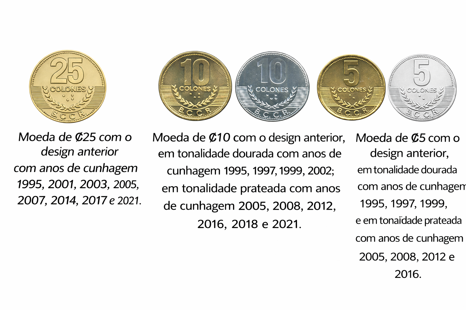 As novas versões das moedas de ₡10 e ₡25 possuem diâmetros menores e composições metálicas atualizadas. O ₡25, por exemplo, tem 22,5 mm, canto liso e duas barras em alto relevo no anverso para facilitar o reconhecimento tátil, além de ser compatível com máquinas automáticas de venda e estacionamento.