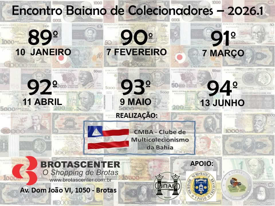 O Encontro Baiano de Colecionadores chega à 90.ª edição no dia 7 de fevereiro de 2026, em Salvador. O evento ocorre no Brotascenter, no bairro de Brotas, e reúne colecionadores de diversas áreas, como numismática, filatelia e itens históricos.