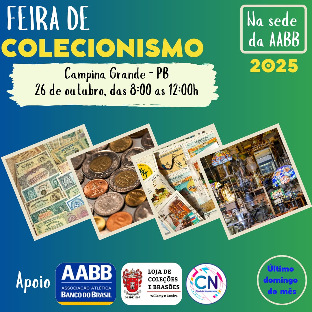 Campina Grande sedia, no dia 26 de outubro, mais uma edição da Feira de Colecionismo, evento organizado pela Loja de Coleções e Brasões, de Willamy e Sandra. A feira será realizada na sede da AABB, das 8h às 12h, reunindo expositores e apreciadores de moedas, cédulas, selos, medalhas e antiguidades em geral.