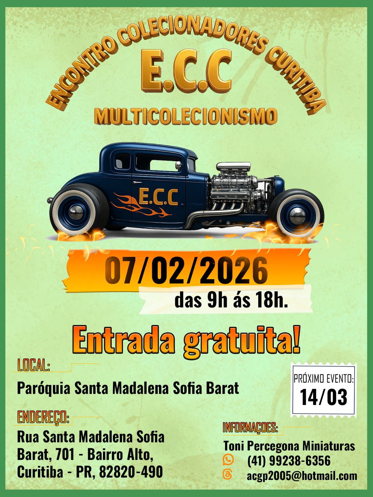 O Encontro Colecionadores Curitiba (E.C.C.) será realizado neste sábado, 7 de fevereiro de 2026, em Curitiba. O evento acontece das 9h às 18h, com entrada gratuita, na Paróquia Santa Madalena Sofia Barat, no Bairro Alto.