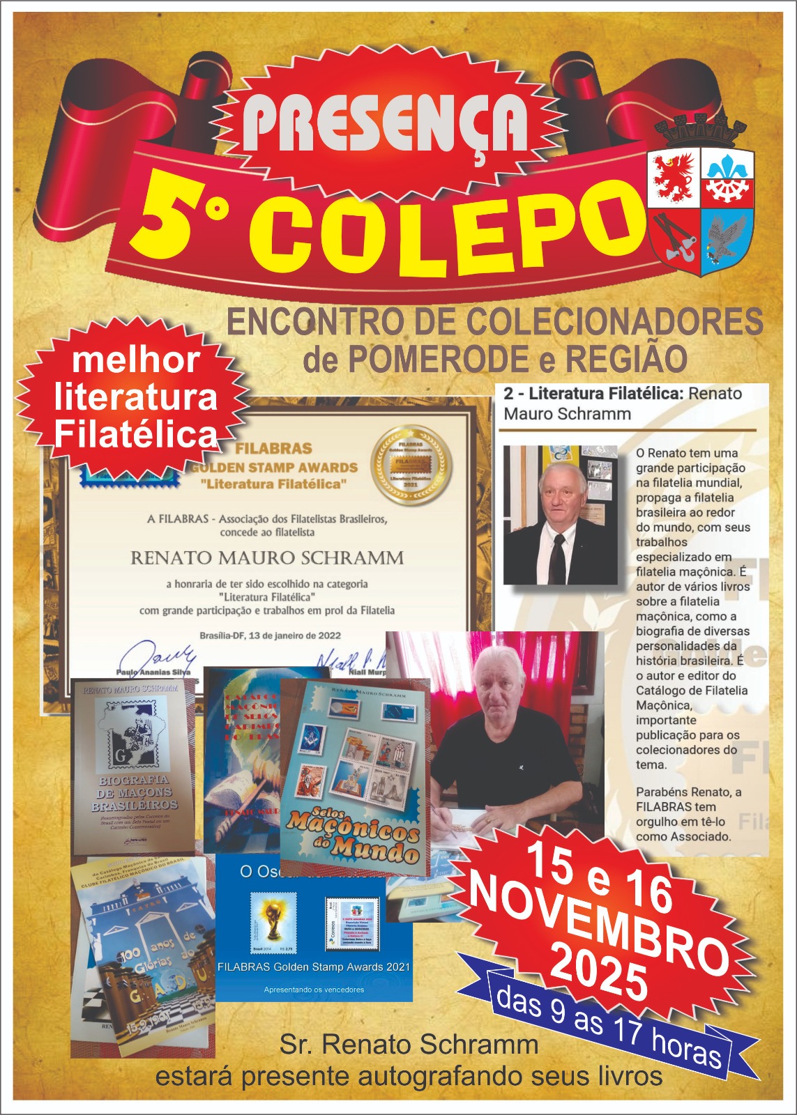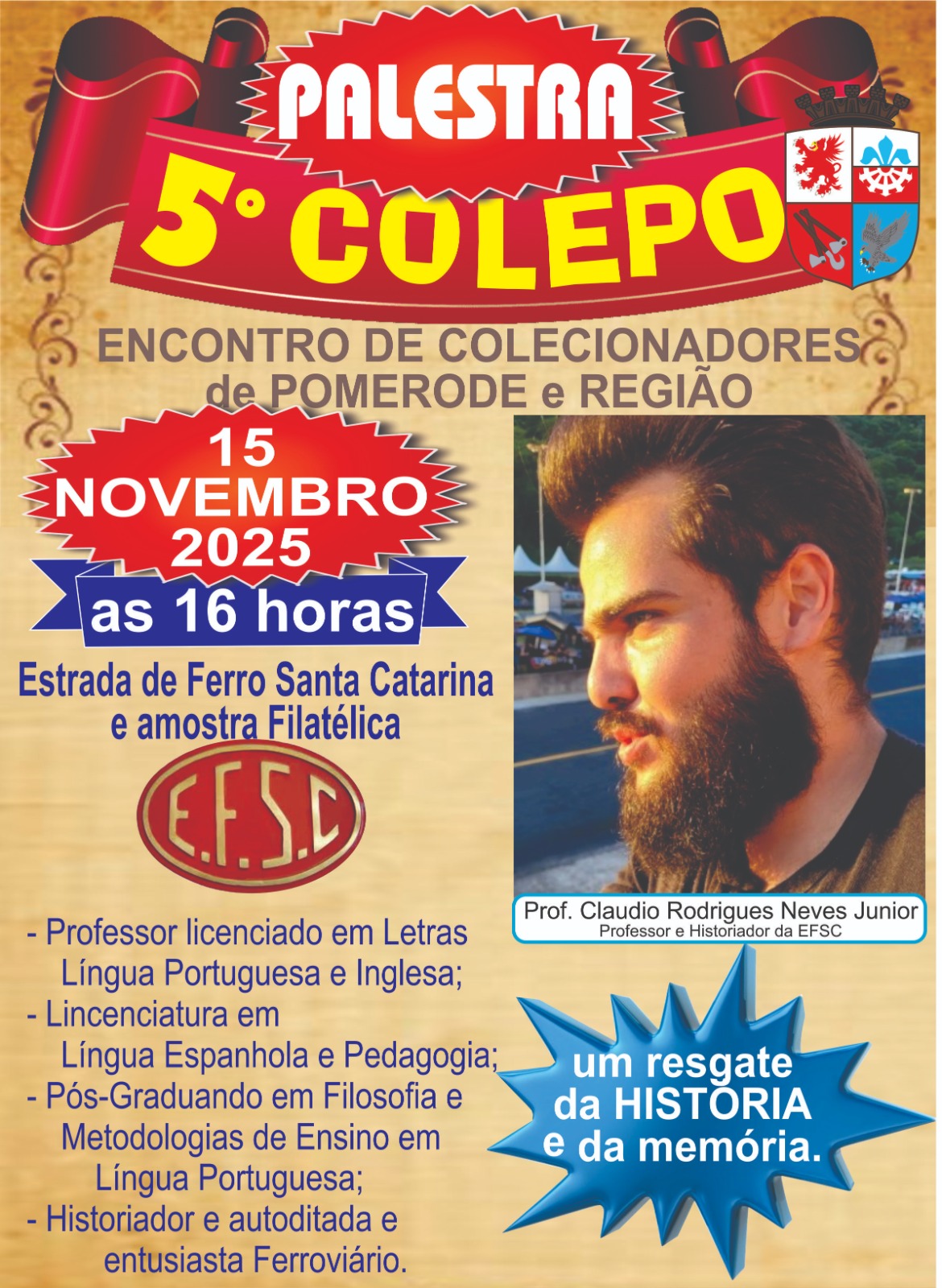 A cidade de Pomerode (SC) sediará, nos dias 15 e 16 de novembro, o 5º Encontro de Colecionadores de Pomerode e Região (COLEPO), reunindo entusiastas de numismática, filatelia e colecionismo em geral. O evento será realizado das 9h às 17h, no Centro Histórico (Rua Hermann Weege, 111, próximo à Cervejaria Schornstein), com entrada gratuita.
