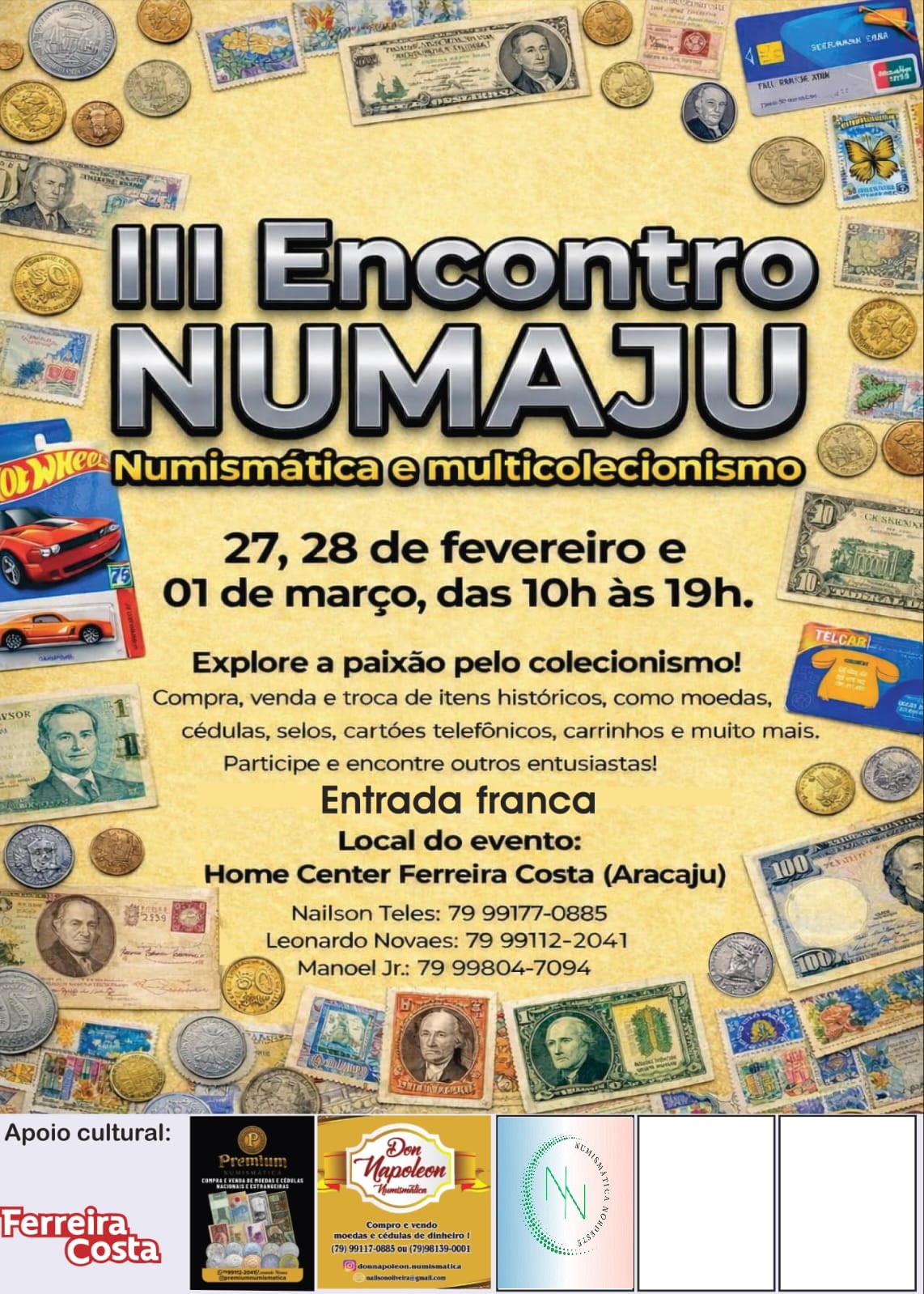 O III Encontro Numaju, voltado à numismática e ao multicolecionismo, será realizado nos dias 27 e 28 de fevereiro e 1.º de março, das 10h às 19h, em Aracaju. O evento acontece no Home Center Ferreira Costa e tem entrada gratuita.