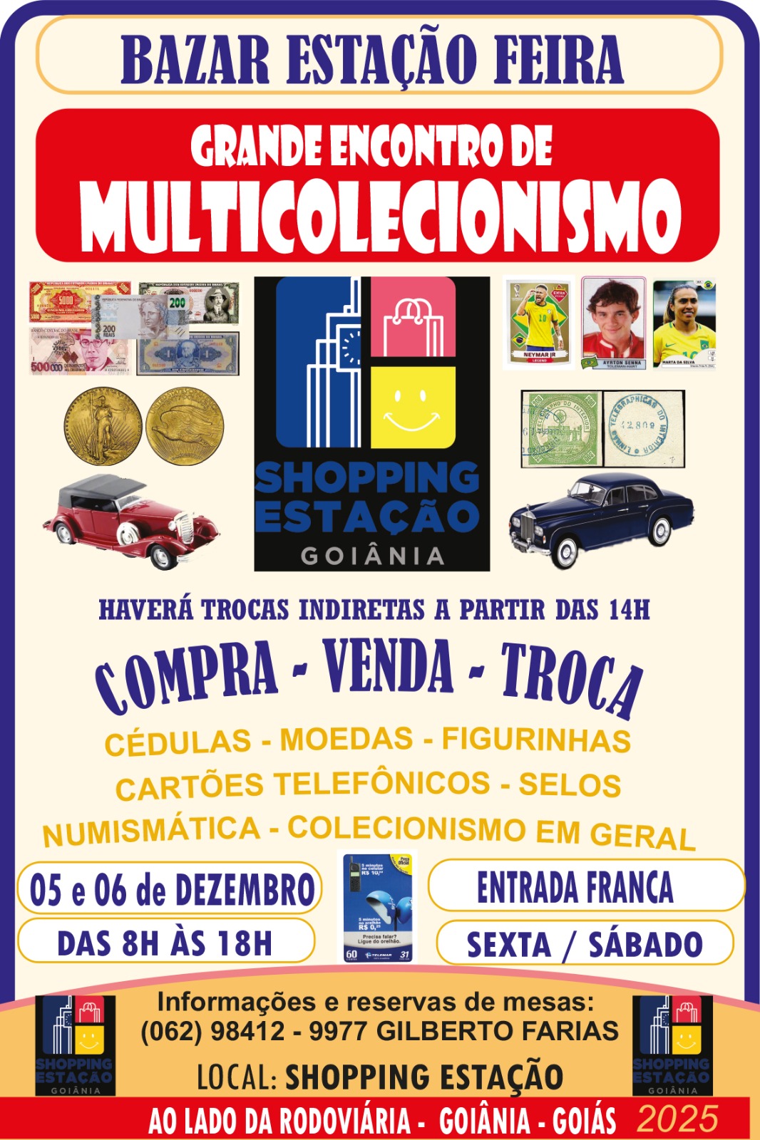 O Shopping Estação, em Goiânia, sediará nos dias 5 e 6 de dezembro, das 8h às 18h, o Grande Encontro de Multicolecionismo, feira que reúne expositores e visitantes para compra, venda e troca de itens como cédulas, moedas, selos, cartões telefônicos, miniaturas e figurinhas. O evento, organizado para incentivar o intercâmbio entre colecionadores, terá entrada franca e começará as trocas indiretas a partir das 14h.